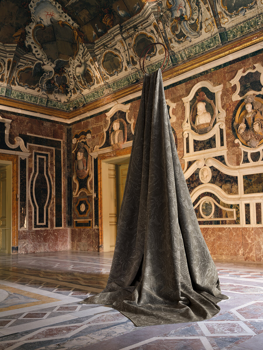 Printed digitally on the finest Italian linen base fabric and embellished with hand-painted brushstrokes, the arabesque motives are highlighted, underlining the sophistication of this Italian-made fabric.