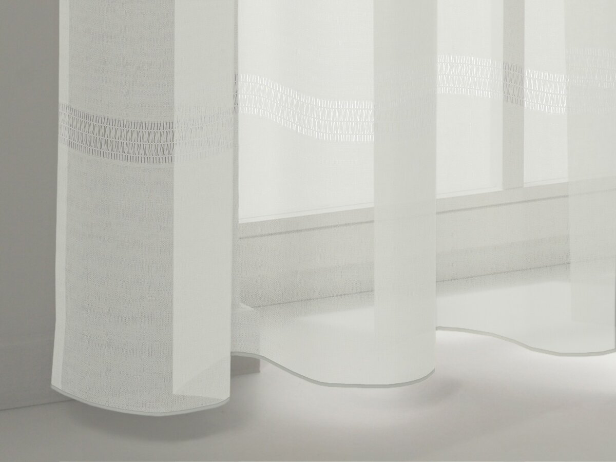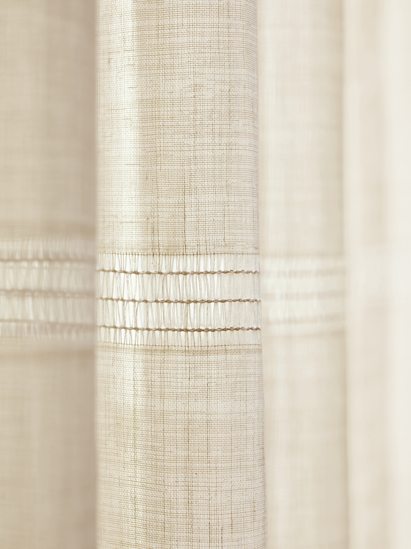 This fabric has a horizontal pattern of ajour-effect stripes in the style of romantic hemstitch embroidery. It is available in five soft non-colours, including white, ivory and sand.