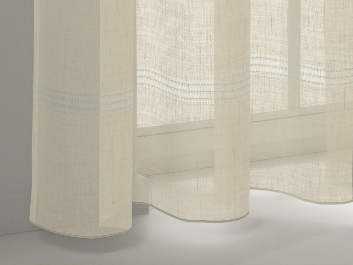 This fabric has a horizontal pattern of ajour-effect stripes in the style of romantic hemstitch embroidery. It is available in five soft non-colours, including white, ivory and sand.