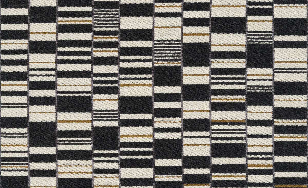 Contrasting rectangular shapes form a rhythmic all-over design. The more neutral color palette is based on a natural spectrum of wood, sand, and earthy tones which are combined with creamy white. The striking monochromatic colourway is softened with ocher accents.