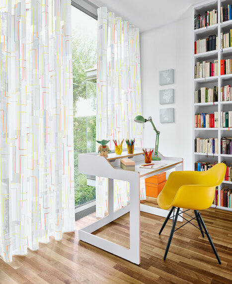 The angular FARO features a well-rounded design! The graphical elements of this burn out fabric showcase a lively interplay of rectangles and lines. They touch one another, overlap one another and create harmonious compositions. The five-colour graphical detailing also harmonises tastefully with each of the base fabric colours, which range from watery colours and greens through to coral and lemony hues.