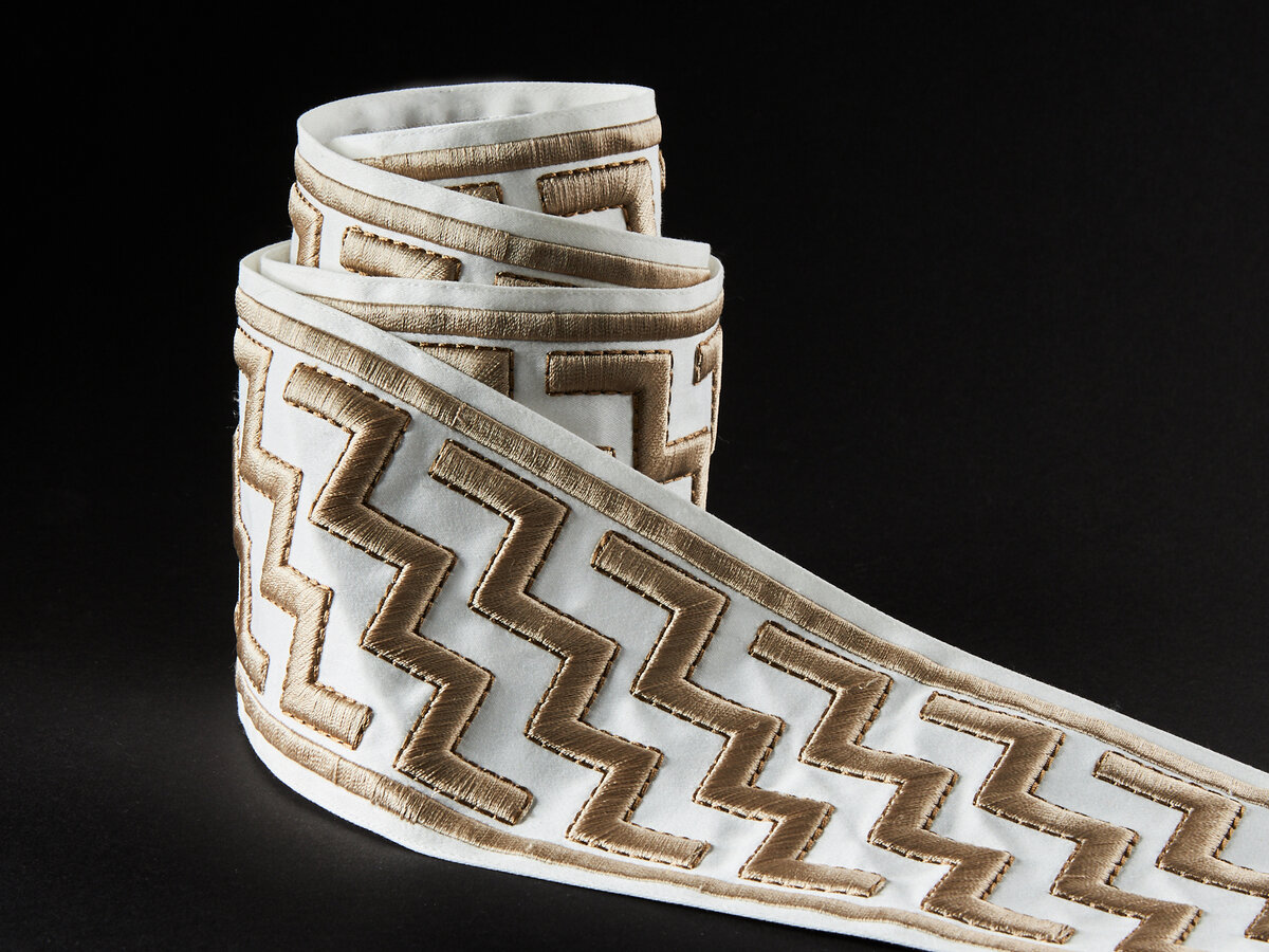 Named for Hugh Ferriss, the architect and illustrator who loved skyscrapers, FERRISS features a bold geometric labyrinth reminiscent of a metropolis. Produced on an 18-head embroidery machine, foam is first placed precisely on top of a lightly stitched outline before a high density satin stitch is used to cover the foam completely. A delicate rice stitch is then applied along the edge of the design, creating a sleek, three-dimensional embroidery. Available in 7 colours, FERRISS is a true showstopper.