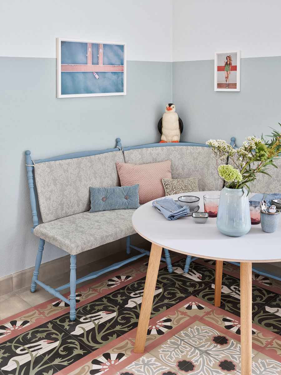 FITZGERALD: a classic design with a modern interpretation. The natural-looking texture of the woven Jacquard evokes embroidery. It lends period furniture and classic pieces, as well as contemporary seating or corner seats, an exquisite look, with colours ranging from deep petrol, medium blue, delicate silver, light eggshell and gallant tobacco.