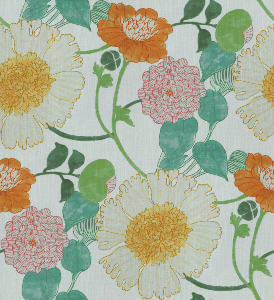 FLANEUR – A snapshot of an idyllic garden. Floral design and fresh colours invite you to take a stroll within your own four walls. Enjoy this modern ambience in floral aqua/lobster against a striking dark petrol background, orange/blue against a fascinating sage green, turquois/terracotta against an elegant silver-grey or green/yellow against a pure white background.