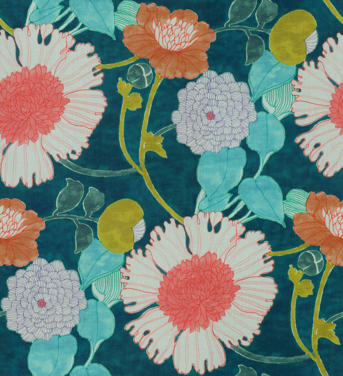 FLANEUR – A snapshot of an idyllic garden. Floral design and fresh colours invite you to take a stroll within your own four walls. Enjoy this modern ambience in floral aqua/lobster against a striking dark petrol background, orange/blue against a fascinating sage green, turquois/terracotta against an elegant silver-grey or green/yellow against a pure white background.