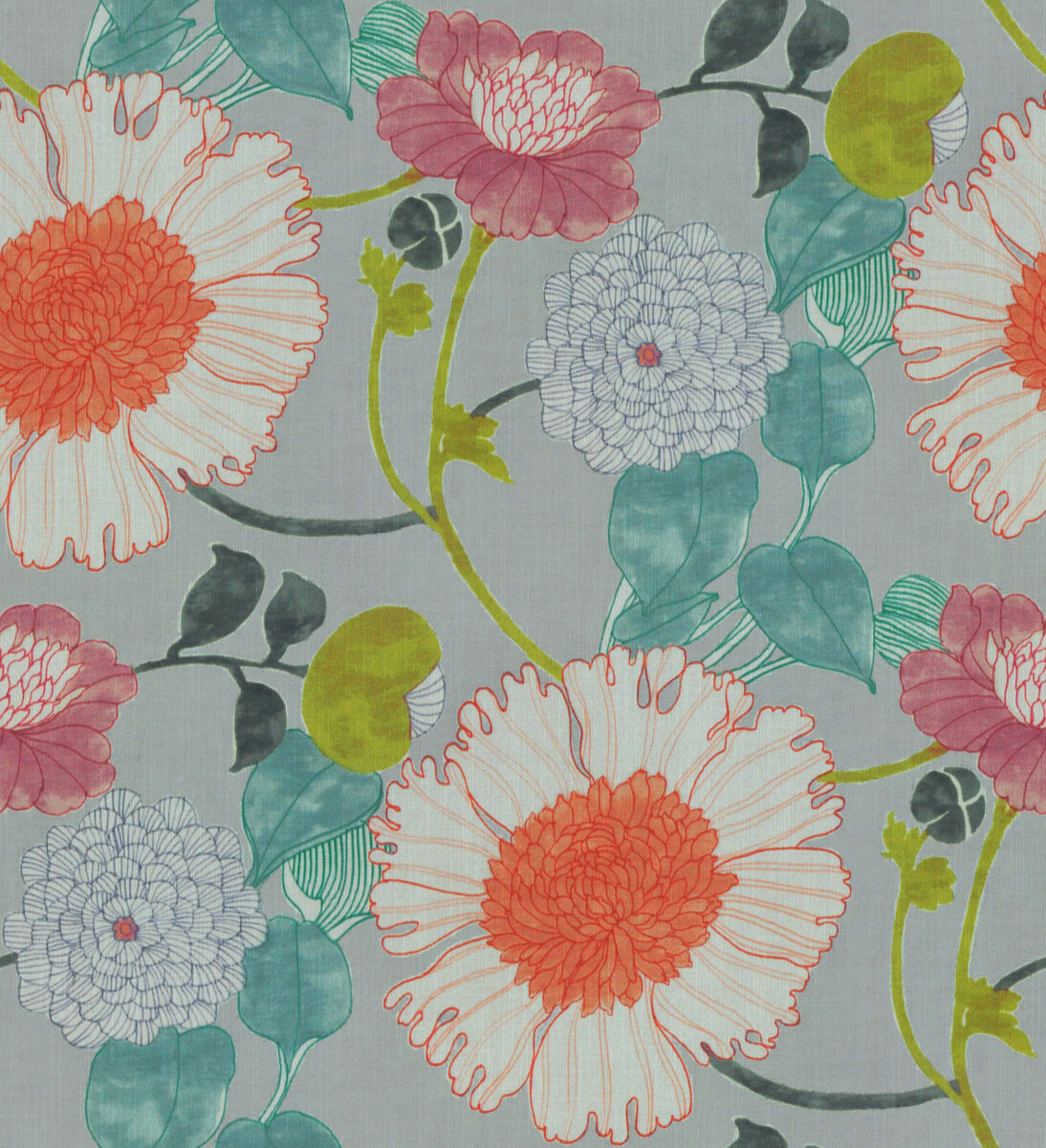 FLANEUR – A snapshot of an idyllic garden. Floral design and fresh colours invite you to take a stroll within your own four walls. Enjoy this modern ambience in floral aqua/lobster against a striking dark petrol background, orange/blue against a fascinating sage green, turquois/terracotta against an elegant silver-grey or green/yellow against a pure white background.