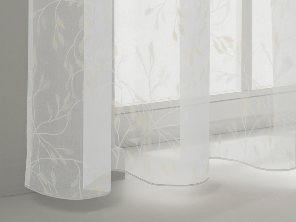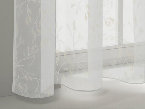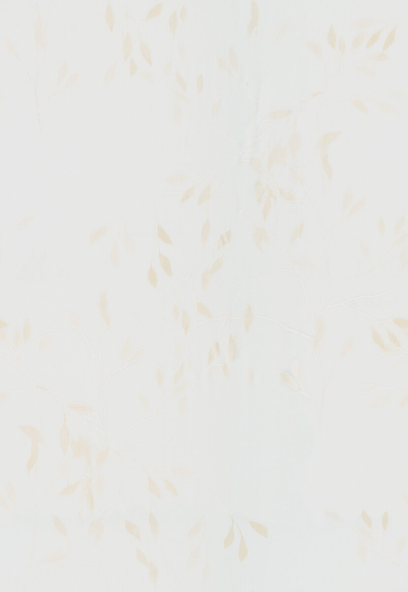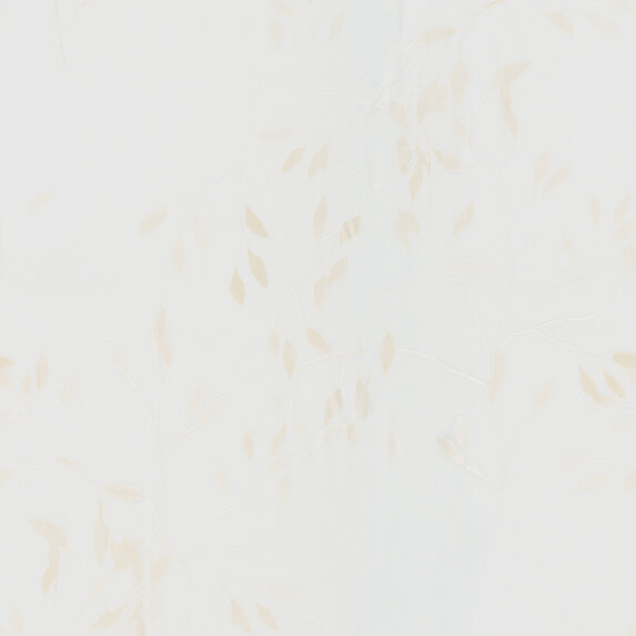 A transparent background featuring a lavish burn out pattern with spiralling opaque blossoms patterned internally with stripes. Available in a choice of white on white, beige and white, grey and white or green and white.