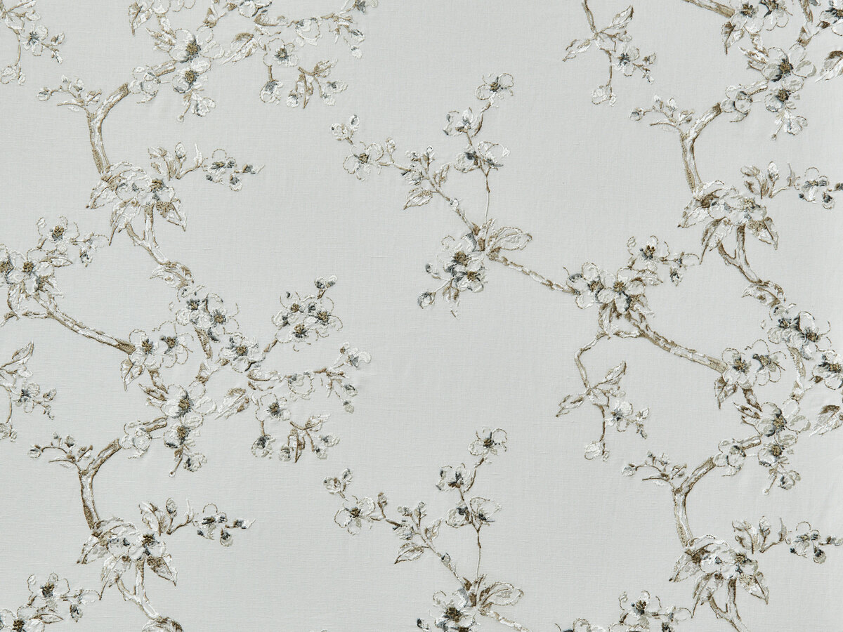 A branch with flowering apple blossoms, which at some points can just about be seen, while rich and full of colour at others, spans a base fabric made of natural cotton and linen. The elegant, four-coloured matte viscose embroidery is inspired by the French artist and member of the Barbizon school, Jean Francois Millet’s A Flowering Apple Tree. It is available in four colours ranging from subtle to playful.