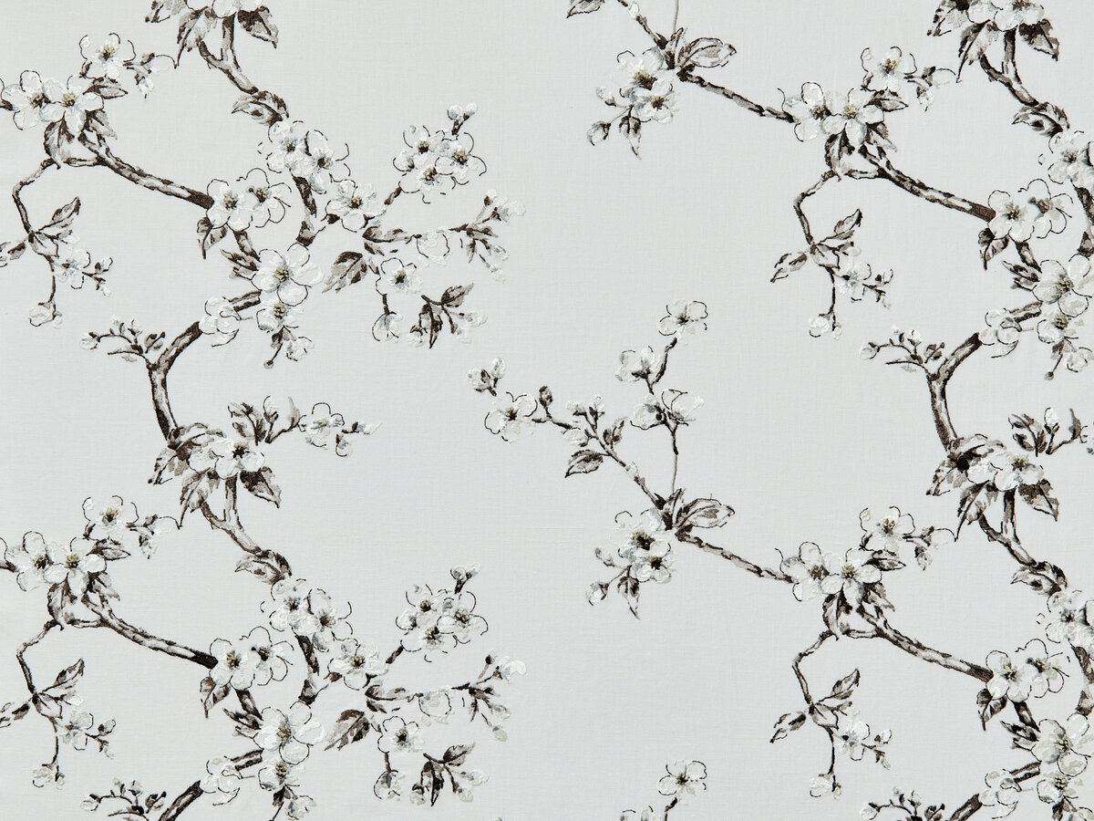 A branch with flowering apple blossoms, which at some points can just about be seen, while rich and full of colour at others, spans a base fabric made of natural cotton and linen. The elegant, four-coloured matte viscose embroidery is inspired by the French artist and member of the Barbizon school, Jean Francois Millet’s A Flowering Apple Tree. It is available in four colours ranging from subtle to playful.
