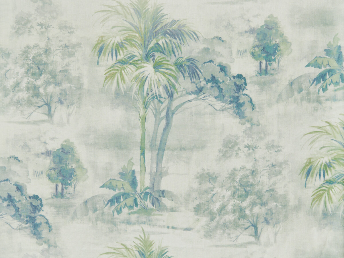 The FRENCH RIVIERA print is characterised by a panel pattern, now characteristic of the ETAMINE Paris collections. In the "toile de Jouy" spirit, a Mediterranean garden scene depicts phoenix palms and cloudy olive trees. Printed on a linen base, FRENCH RIVIERA comes in natural tones, from sand neutrals to palm greens.