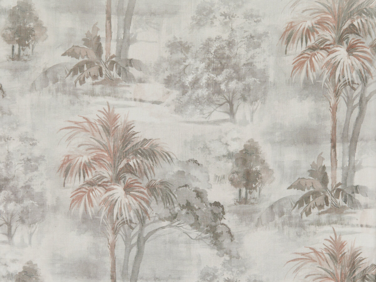 The FRENCH RIVIERA print is characterised by a panel pattern, now characteristic of the ETAMINE Paris collections. In the "toile de Jouy" spirit, a Mediterranean garden scene depicts phoenix palms and cloudy olive trees. Printed on a linen base, FRENCH RIVIERA comes in natural tones, from sand neutrals to palm greens.