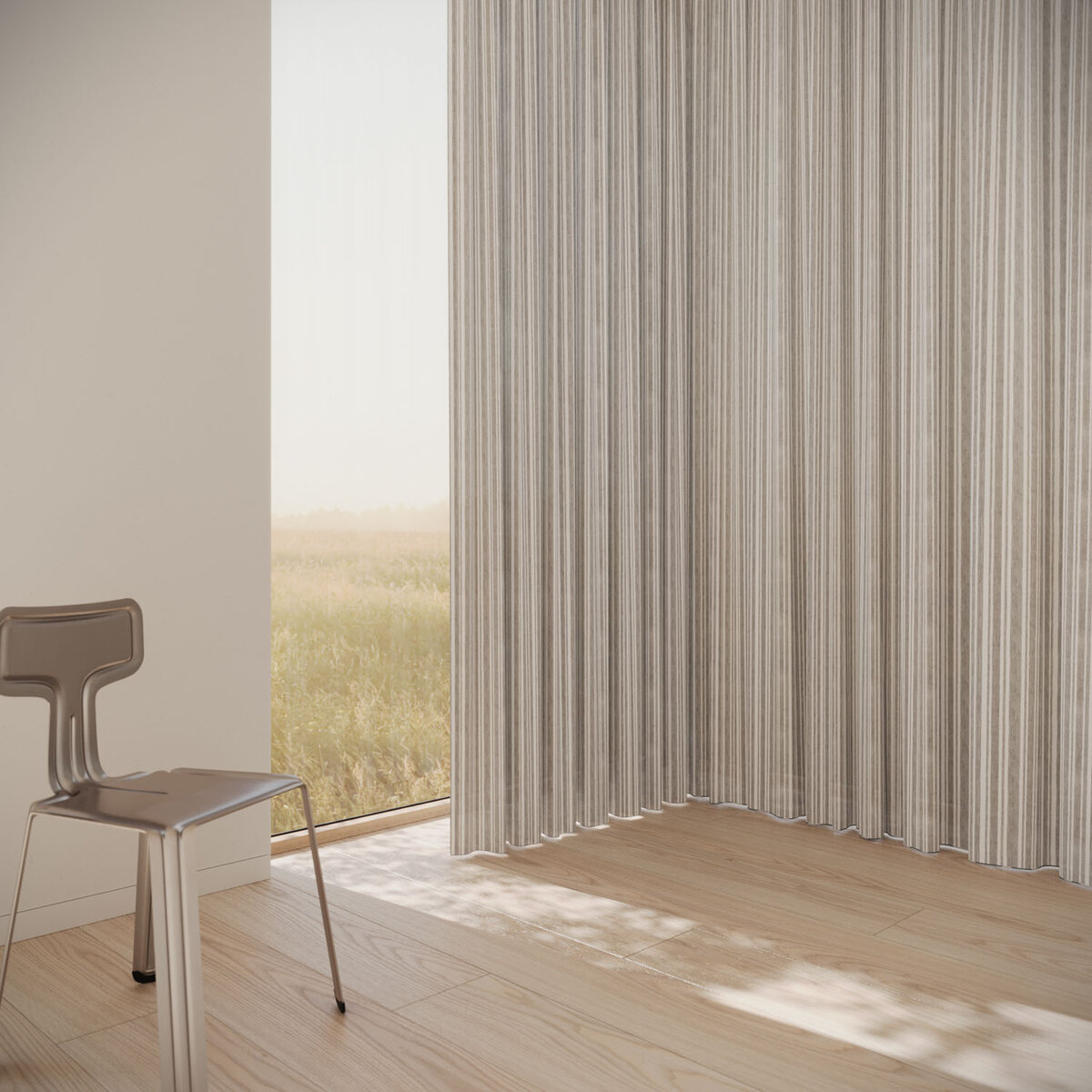 FRIZZANTE brings movement and rhythm through its lively stripe. Produced with solution-dyed technology, it delivers exceptional colorfastness, water and oil resistance (PFAS-free) and sustainable production with minimal water use. Ideal for sun-drenched windows, conservatories or breezy interior partitions - refreshing like a summer day yet enduring like a classic.