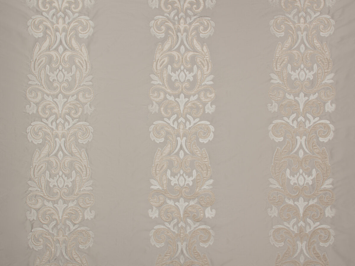 Well-proportioned stripes of pure silk in an elegant range of colours. The contrast between the silk background, the velour appliqué and the embroidery highlights the sophistication and radiance of this textile.