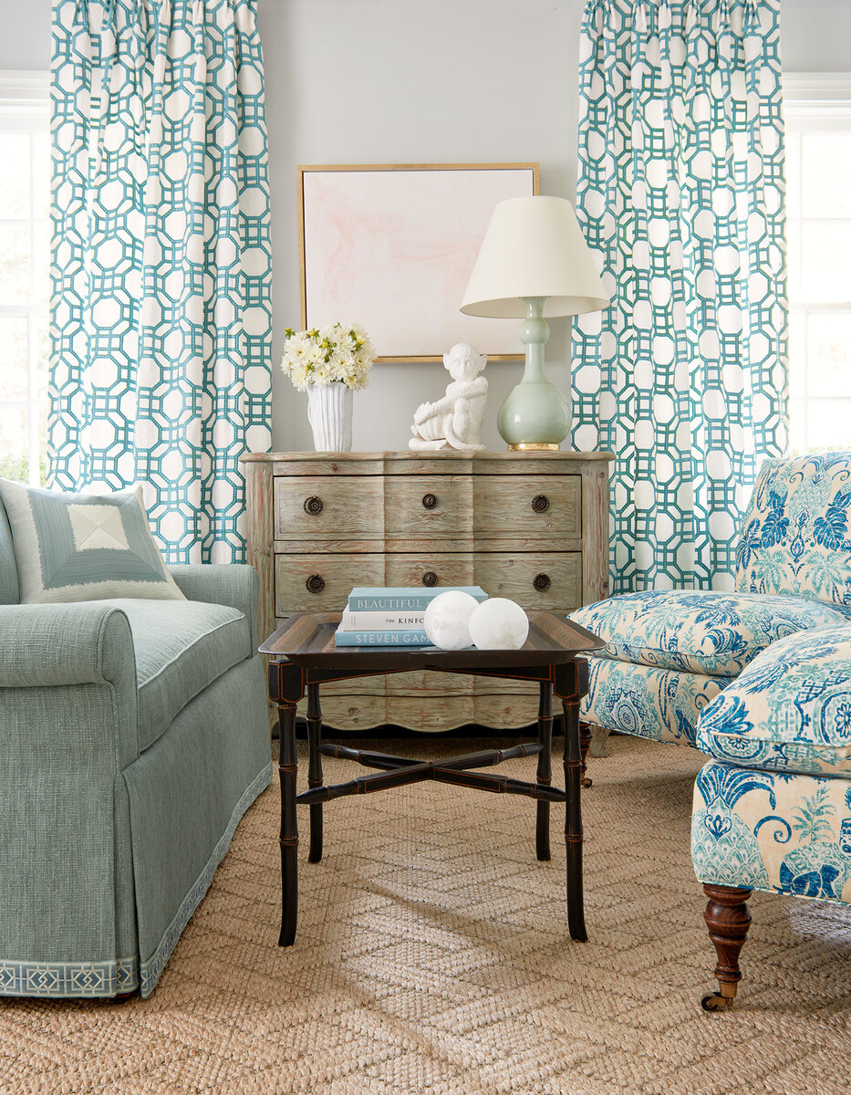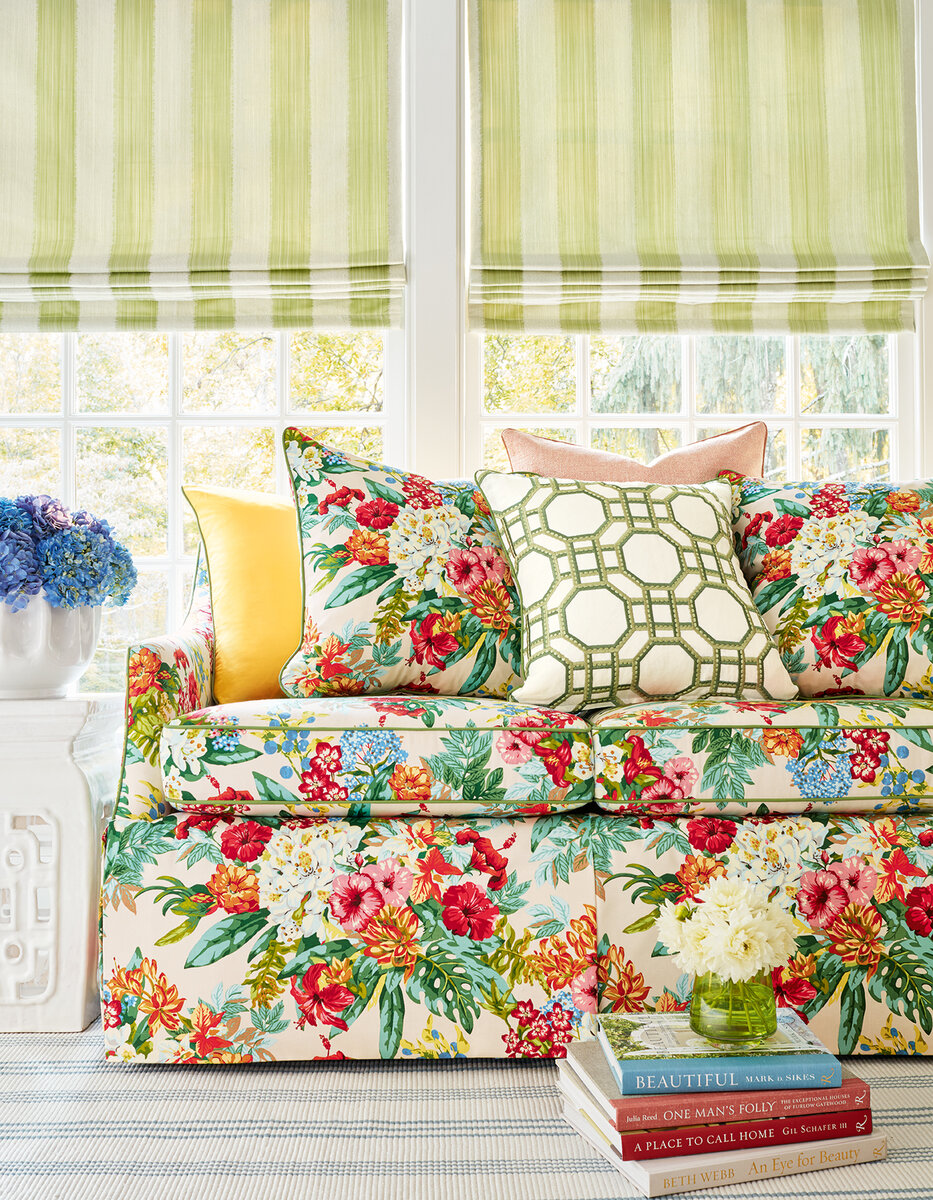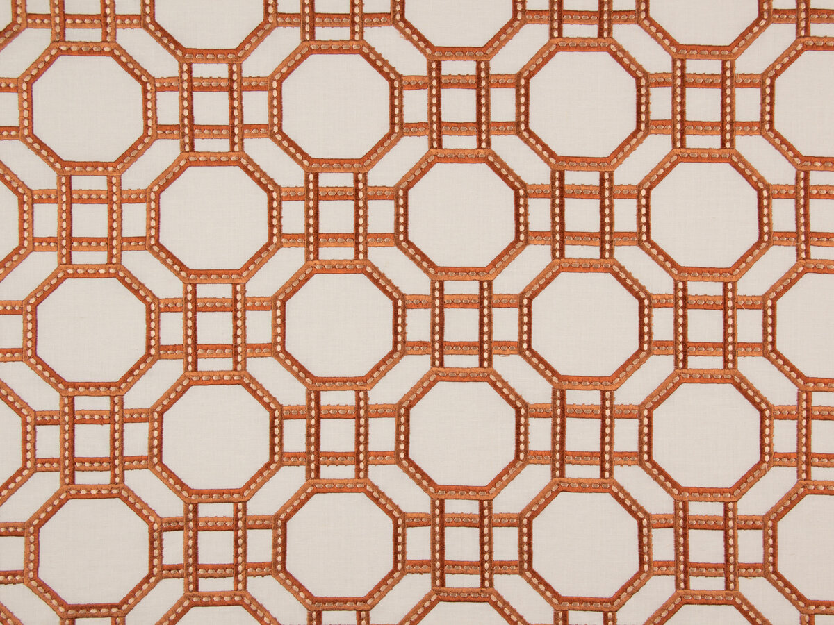 Two-toned viscose embroidery with a calendared finish gives elegance to this timeless lattice design. Clever stitch detailing adds interest and the clean white linen ground cloth brightens the lively, handsome colourations.