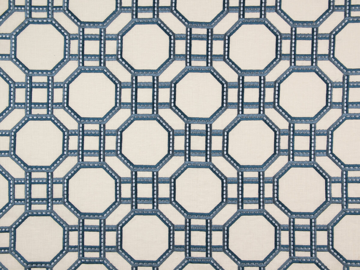 Two-toned viscose embroidery with a calendared finish gives elegance to this timeless lattice design. Clever stitch detailing adds interest and the clean white linen ground cloth brightens the lively, handsome colourations.