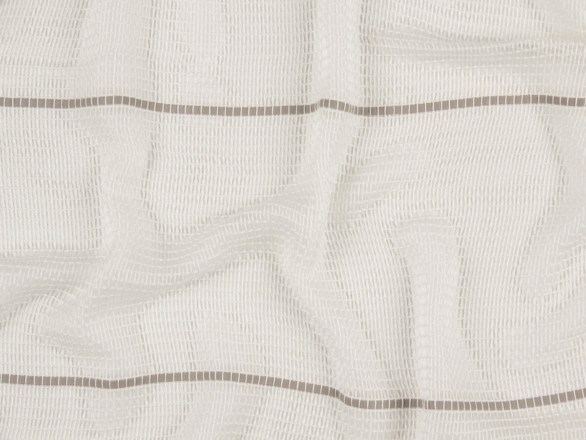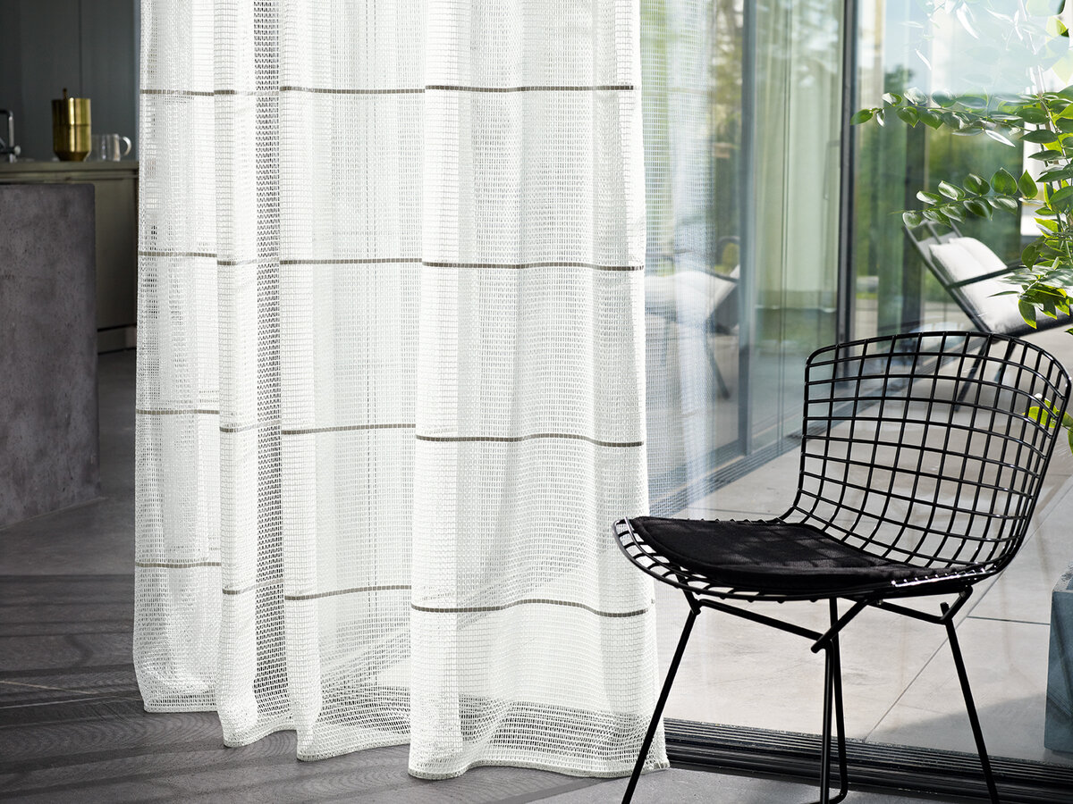 The base fabric of Gene consists of an open, woven construction with a dry, rustic yarn. A ribbon with a leather look is woven into the fabric using a special warp arrangement and hangs horizontally in the window at recurring intervals.