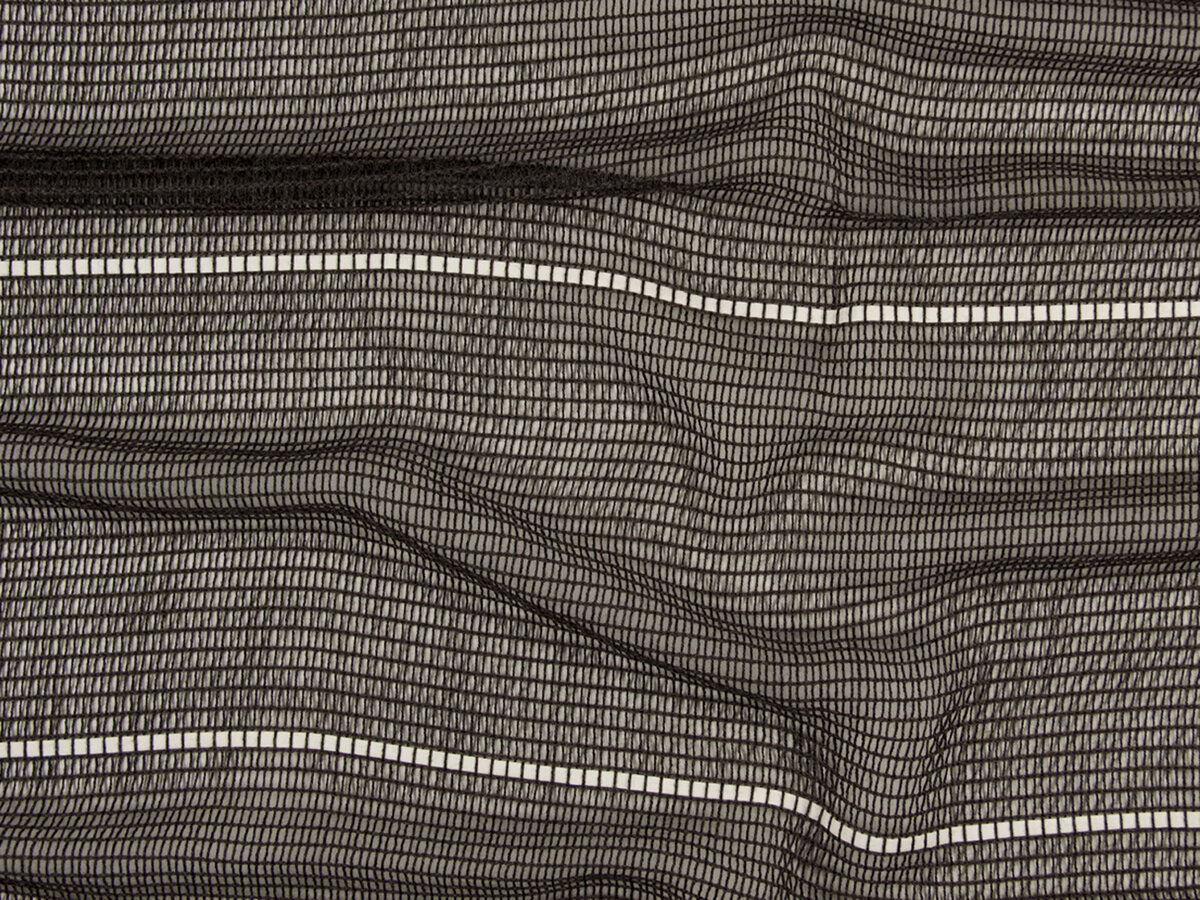 The base fabric of Gene consists of an open, woven construction with a dry, rustic yarn. A ribbon with a leather look is woven into the fabric using a special warp arrangement and hangs horizontally in the window at recurring intervals.