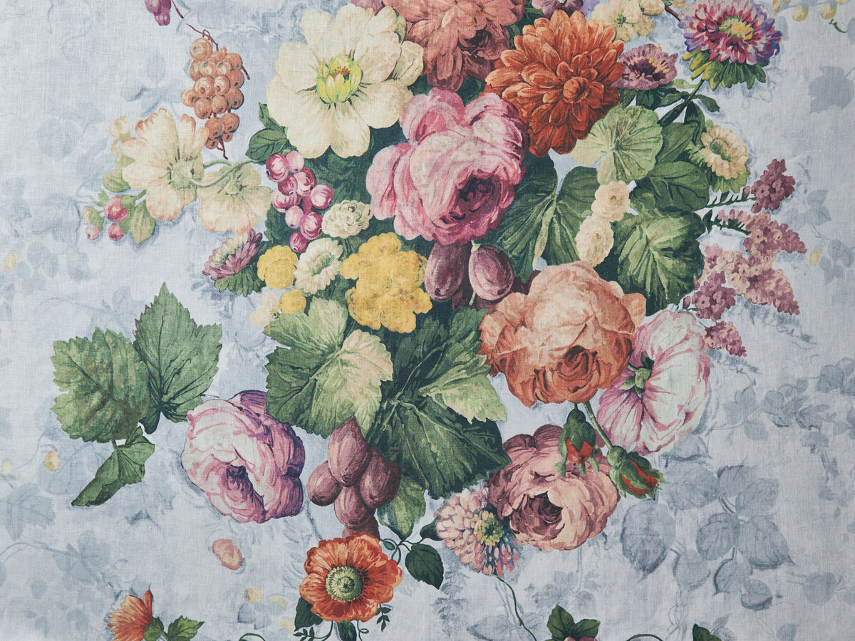 Named for the ‘Greensward Plan’, Frederick Law Olmstead’s winning proposal for the creation of Central Park, GREENSWARD BOUQUET is a collection highlight. The inspiration for it came from an old document purchased long ago, which was then redeveloped and painted by hand. An oversized scale combined with distressed detailing gives GREENSWARD BOUQUET an antique feel reminiscent of a fresco painting. Printed on a 100 per cent linen base cloth, over 30 colours are used to create each of the three available colorations.
