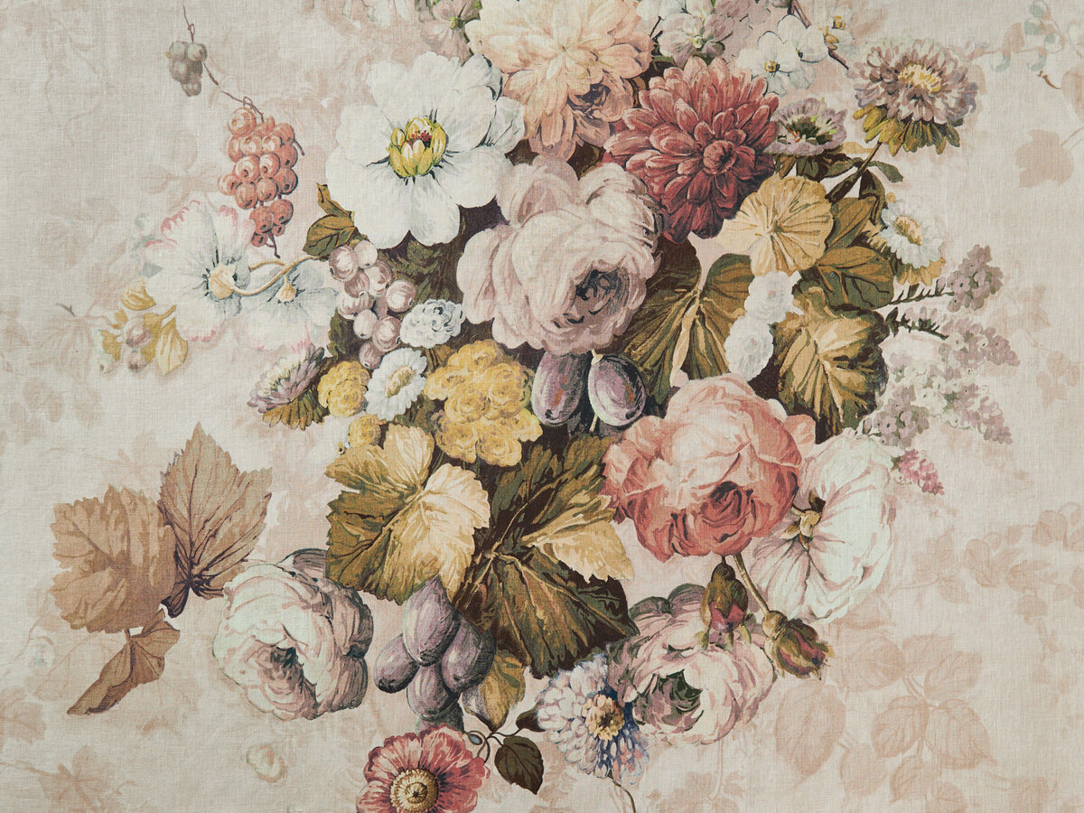 Named for the ‘Greensward Plan’, Frederick Law Olmstead’s winning proposal for the creation of Central Park, GREENSWARD BOUQUET is a collection highlight. The inspiration for it came from an old document purchased long ago, which was then redeveloped and painted by hand. An oversized scale combined with distressed detailing gives GREENSWARD BOUQUET an antique feel reminiscent of a fresco painting. Printed on a 100 per cent linen base cloth, over 30 colours are used to create each of the three available colorations.