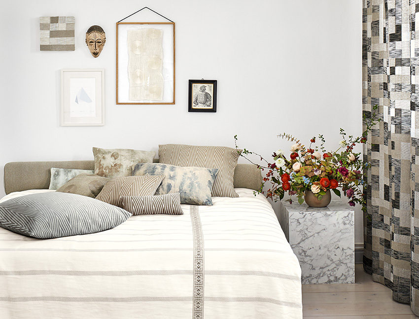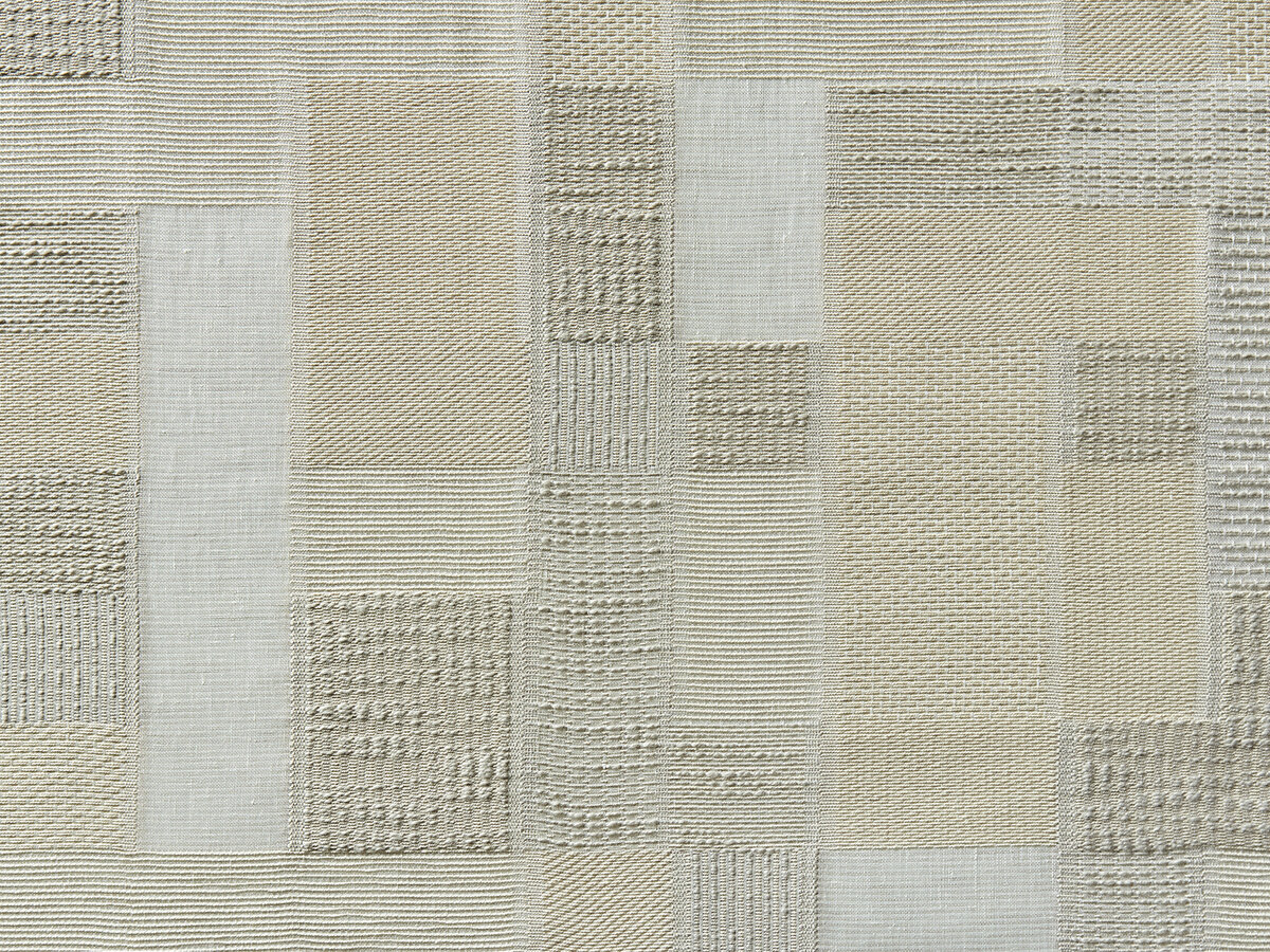 This item, with an elaborate repeat that embellishes its entire width, is a homage to the superb textile work carried out by British artist Barbara Hepworth in the 1920s. We have interpreted her characteristic geometrical style by juxtaposing rectangular striped panels on a semi-transparent base fabric by means of a Scherli process.