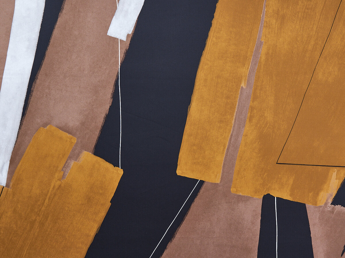 Printed digitally onto finest cotton satin, the sweeping generous brushstrokes form to create a dynamic all-over design. The richly contrasting combination of the painterly color fields and the fine lines is impactful from a distance while also convincing on closer inspection with its attention to detail.