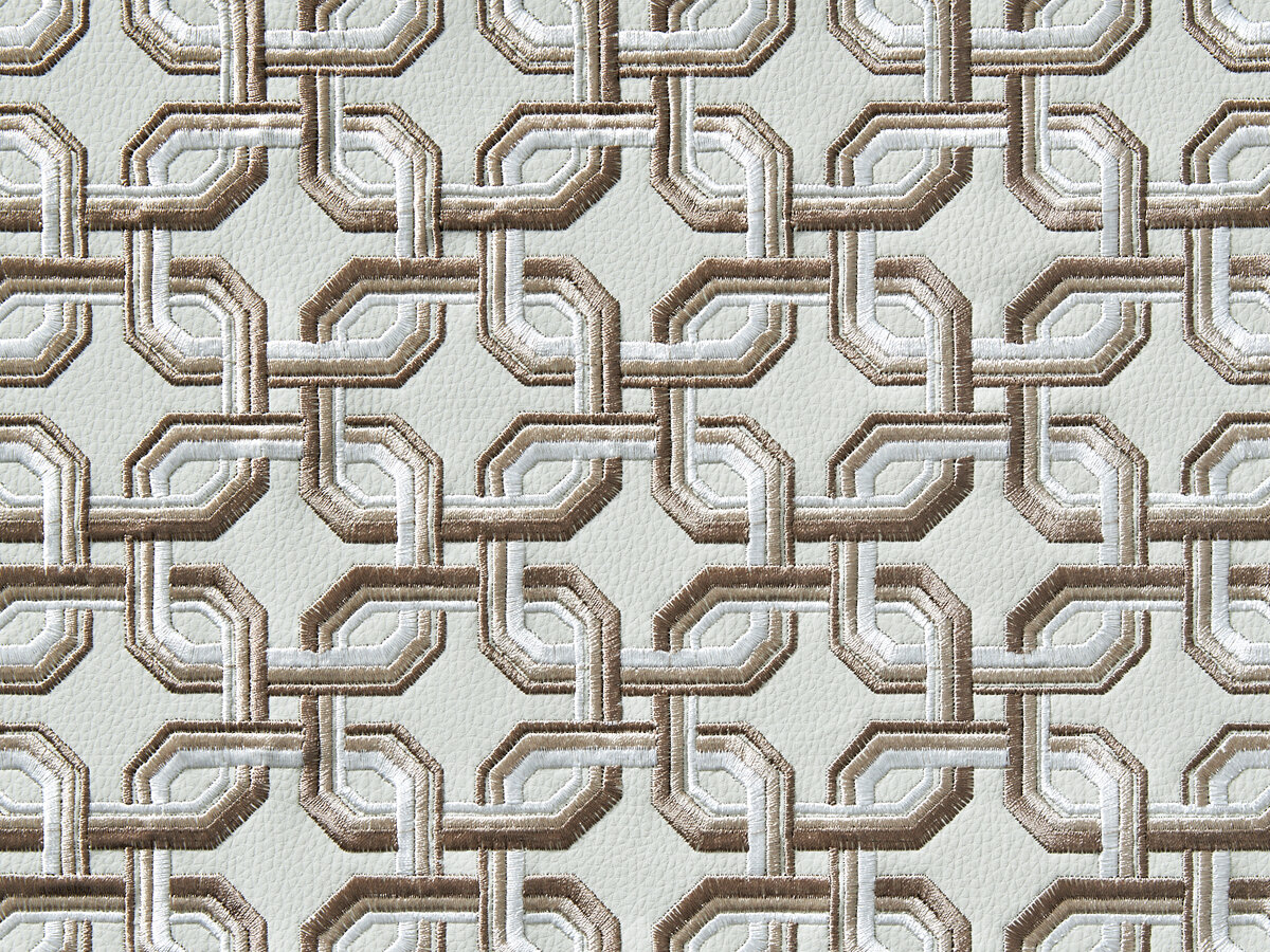 This is a decorative upholstery fabric in an all-over look with embroidered motifs on faux leather. The subtle nuance of the colour composition in the embroidery underscores the fabric’s three-dimensional effect and accentuates the rhythmic sensation created by the pattern. ICONA draws you in with its vibrant colour palette and clear graphic effect.