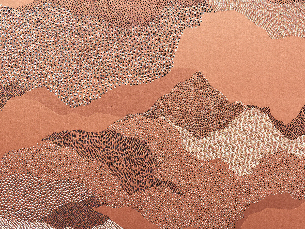 The different weave effects, delicately hinted at, are comprised of countless small dots reminiscent of a floating cloud formation.