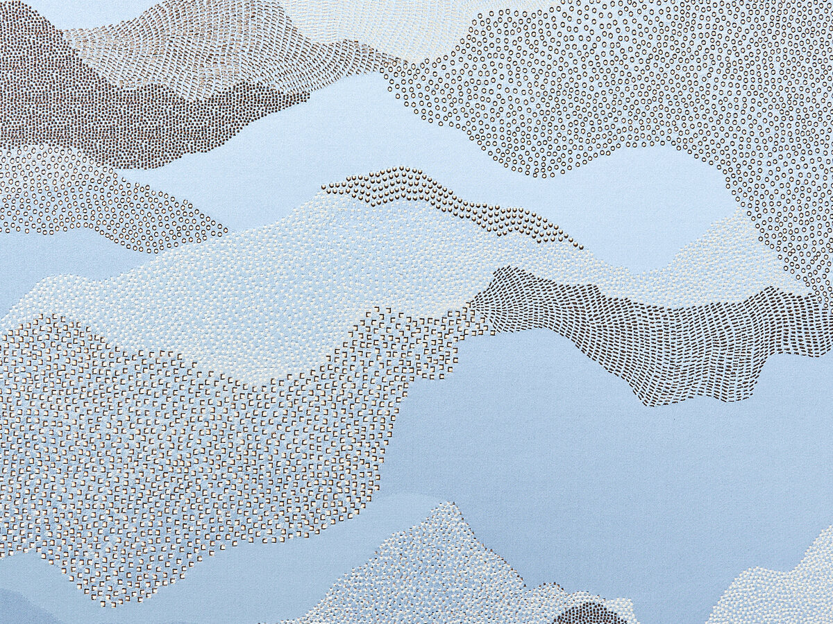 The different weave effects, delicately hinted at, are comprised of countless small dots reminiscent of a floating cloud formation.