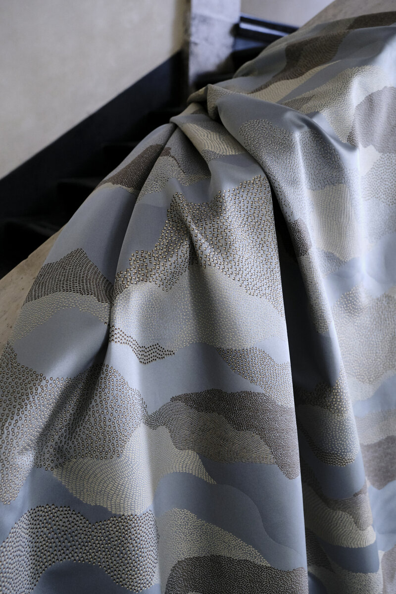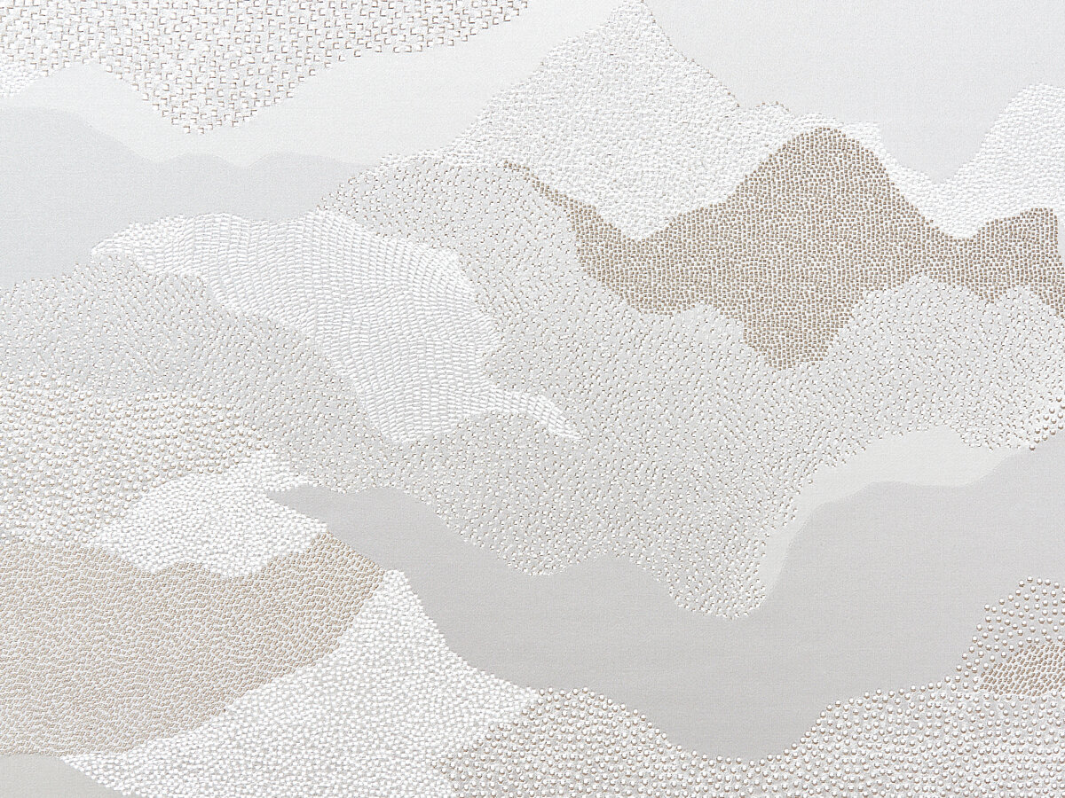 The different weave effects, delicately hinted at, are comprised of countless small dots reminiscent of a floating cloud formation.