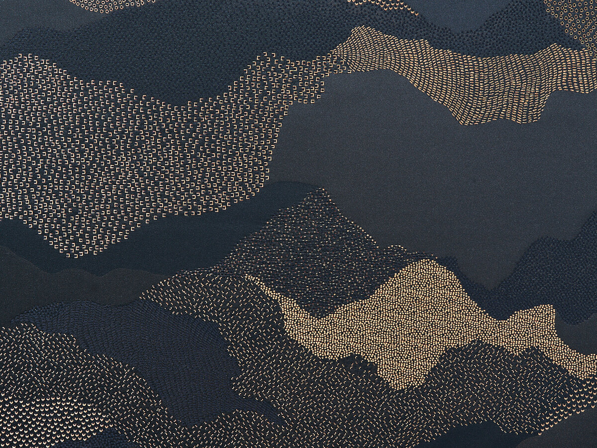 The different weave effects, delicately hinted at, are comprised of countless small dots reminiscent of a floating cloud formation.
