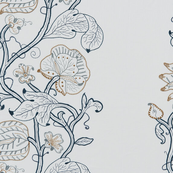 A contemporary take on the classic Tree of Life design, JACOBEAN VINE was inspired by an original all over document that was reworked into a detailed multicolor climbing vine. The variety of stitches used combine the artistry of the traditional movement of curves with more modern abstract angular stitching, resulting in a modern interpretation of original seventeenth century Jacobean designs.