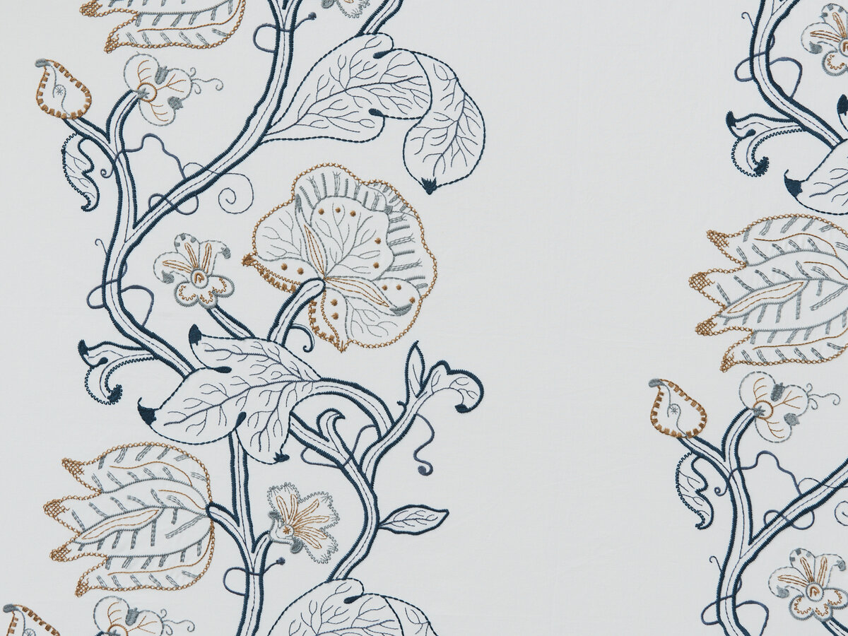 A contemporary take on the classic Tree of Life design, JACOBEAN VINE was inspired by an original all over document that was reworked into a detailed multicolor climbing vine. The variety of stitches used combine the artistry of the traditional movement of curves with more modern abstract angular stitching, resulting in a modern interpretation of original seventeenth century Jacobean designs.
