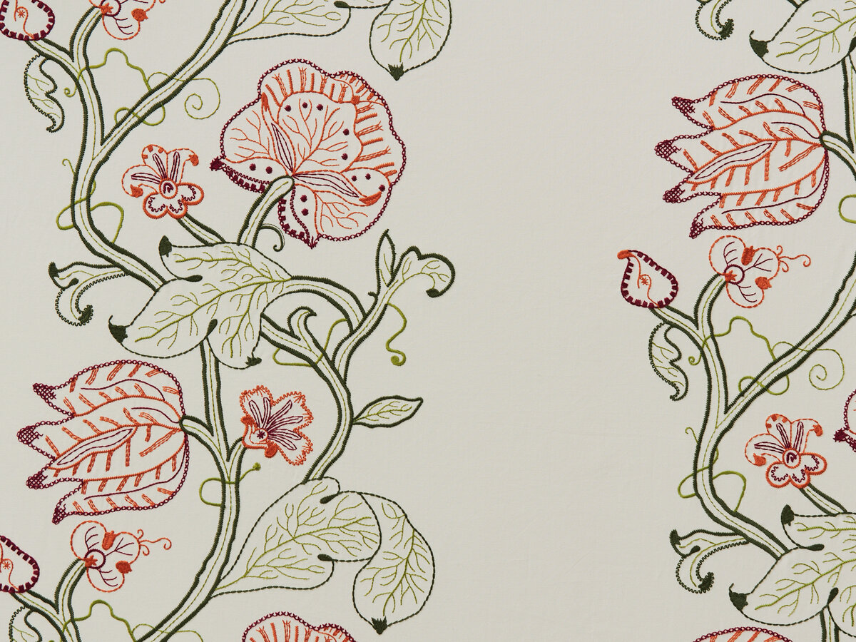 A contemporary take on the classic Tree of Life design, JACOBEAN VINE was inspired by an original all over document that was reworked into a detailed multicolor climbing vine. The variety of stitches used combine the artistry of the traditional movement of curves with more modern abstract angular stitching, resulting in a modern interpretation of original seventeenth century Jacobean designs.