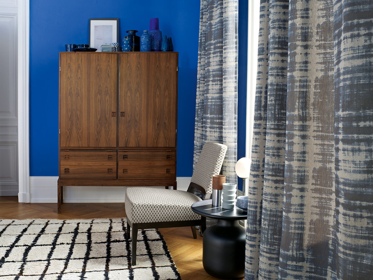 This room-height decorative fabric features a washed-out colour effect that recalls the patinas that form on old walls. It also evokes masterful abstract paintings. Opaque with a slight black-out effect, this Jacquard fabric is well suited for airy, modern window decorations.