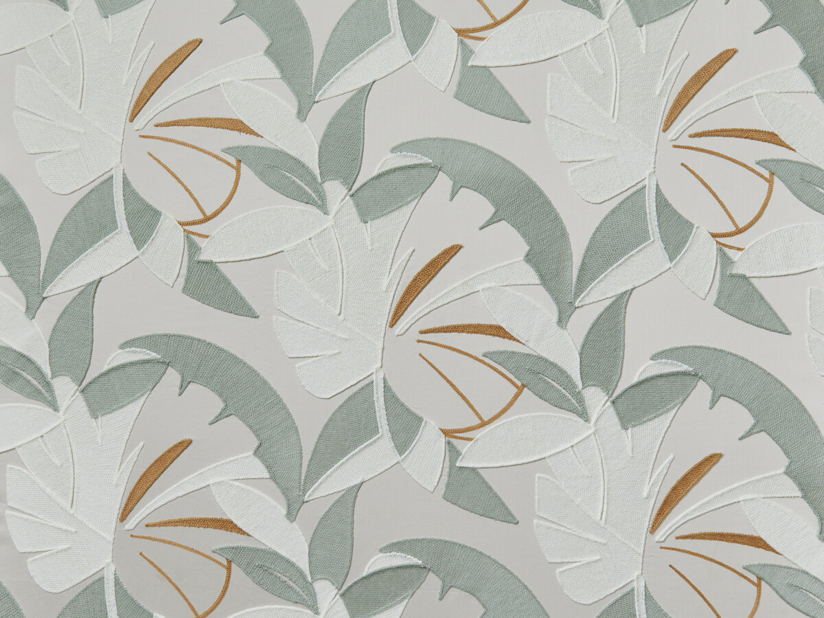 This fabric embroidered on cotton satin confirms ETAMINE Paris' attraction to botanical exuberance. Like in a secret garden, the leaves mix and mingle rhythmically to form one. The embroidery work here is extremely time-consuming. Each leaf is embroidered in chain stitch with a matte wool thread, the direction of the stitches delicately following the shapes.