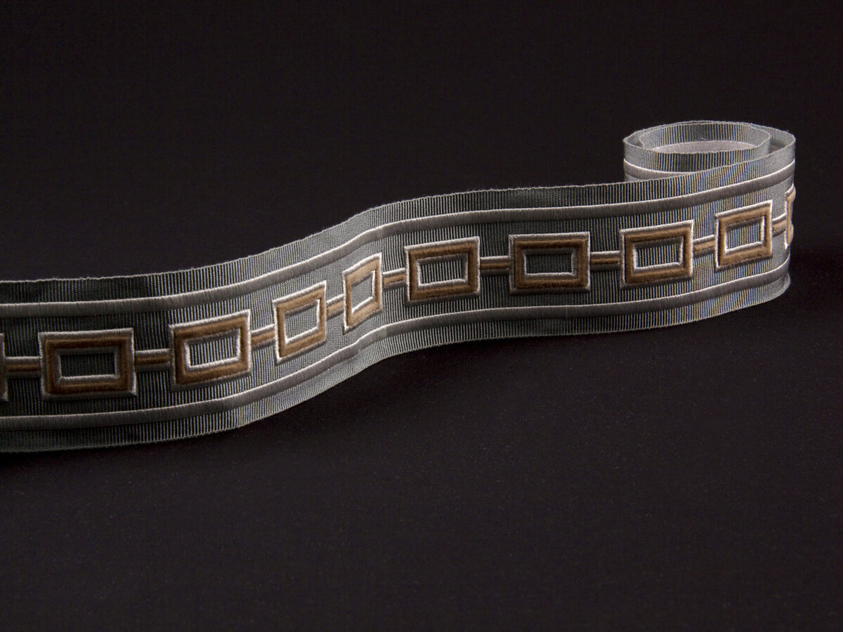 Crisp and elegant, the satin embroidery stitch on the grosgrain ribbon sets off the velvet applique of this classic geometric border.