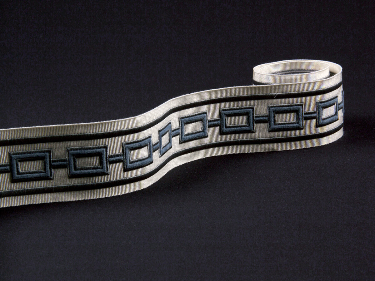 Crisp and elegant, the satin embroidery stitch on the grosgrain ribbon sets off the velvet applique of this classic geometric border.