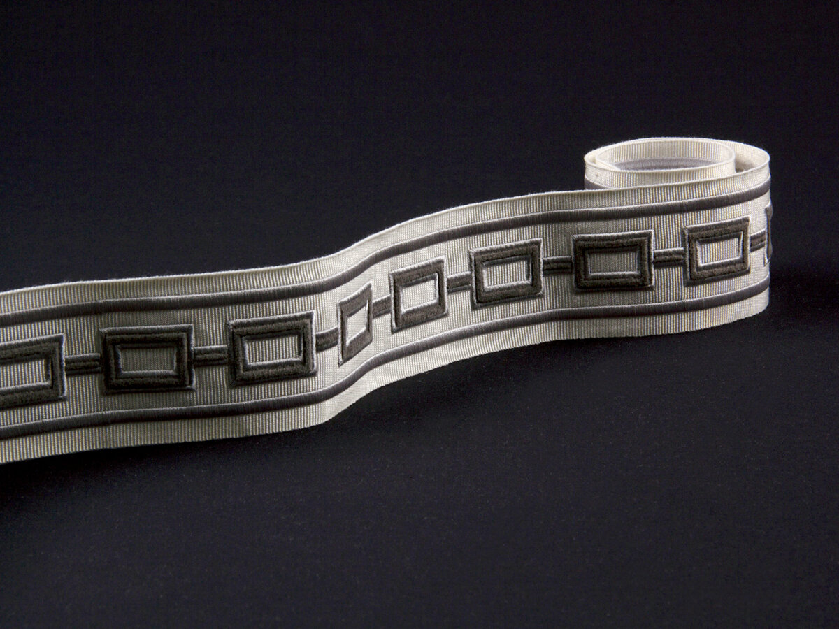 Crisp and elegant, the satin embroidery stitch on the grosgrain ribbon sets off the velvet applique of this classic geometric border.