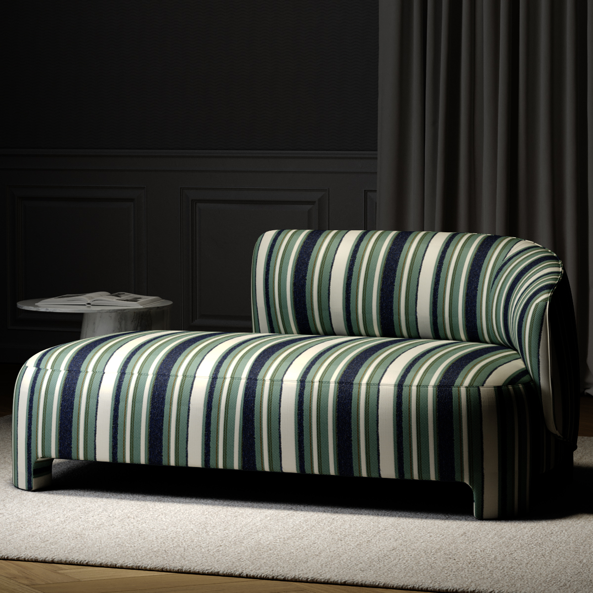 A stripe inspired by a parasol motif, JUAN-LES-PINS conjures the old-world charm of beaches near the Grand Hotel.