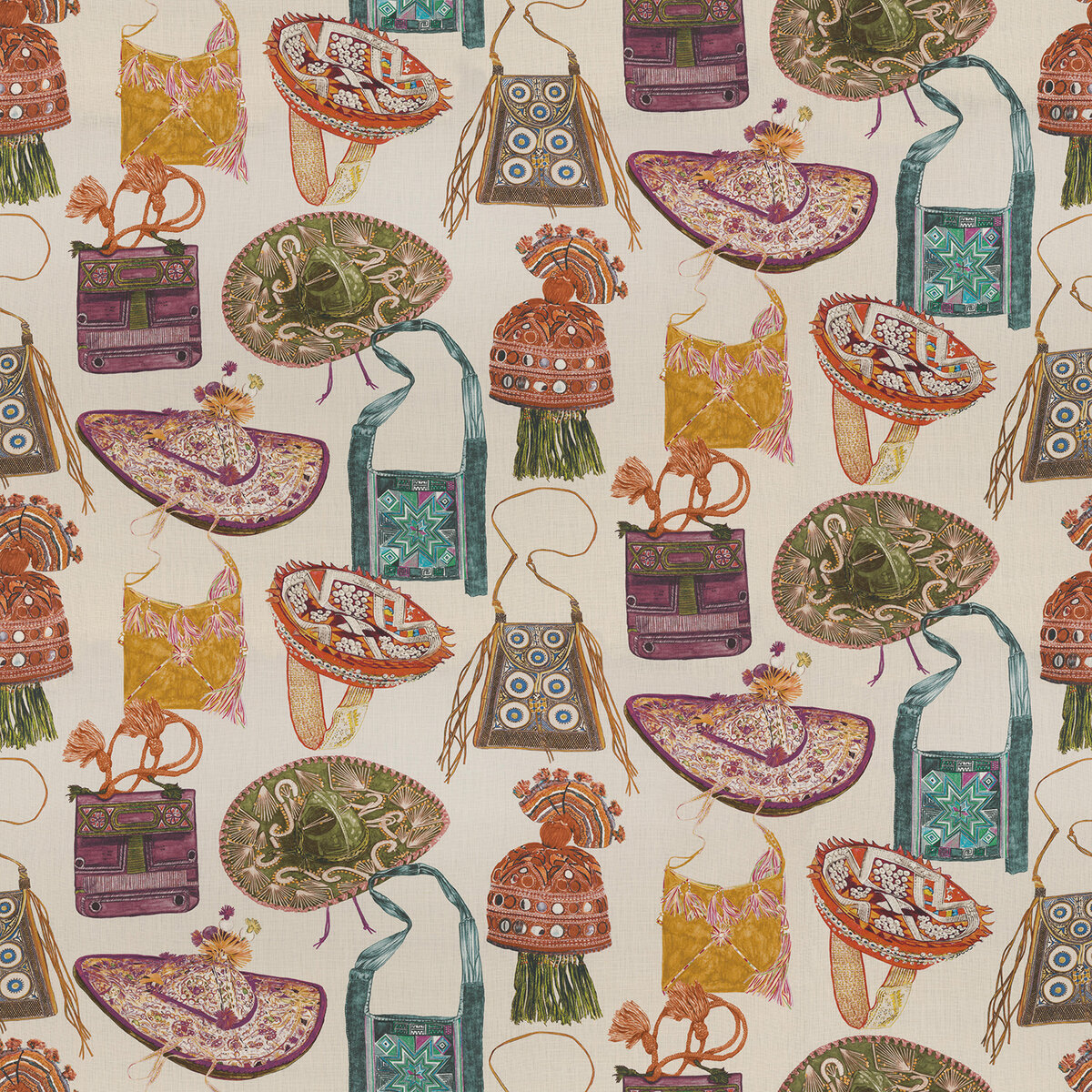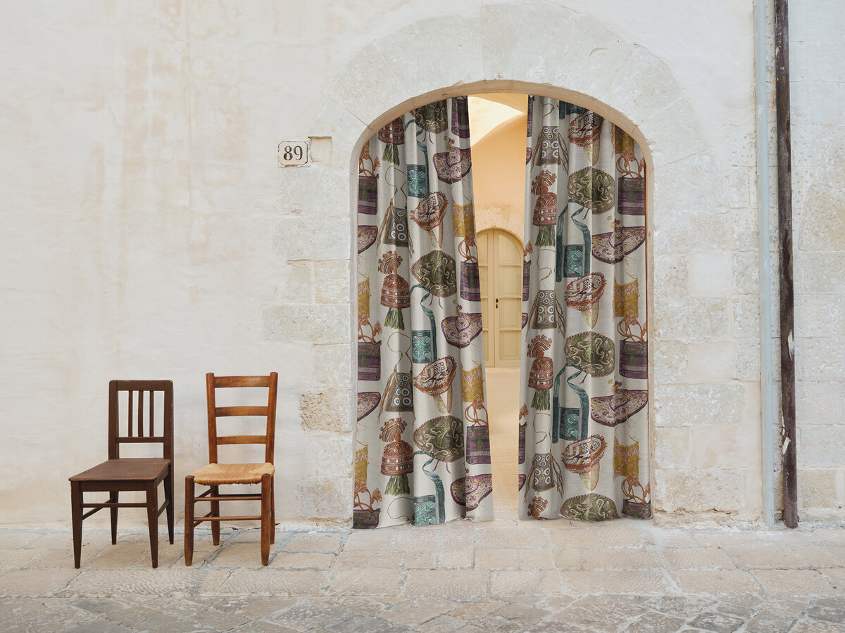 Kashan is an expression meaning ‘ancient cities’ reminiscent of exploration. Hats and bags are playfully arranged on the printed fabric as a homage to the craftsmanship of South America, Uzbekistan, India, and Vietnam.