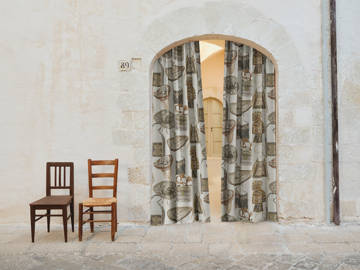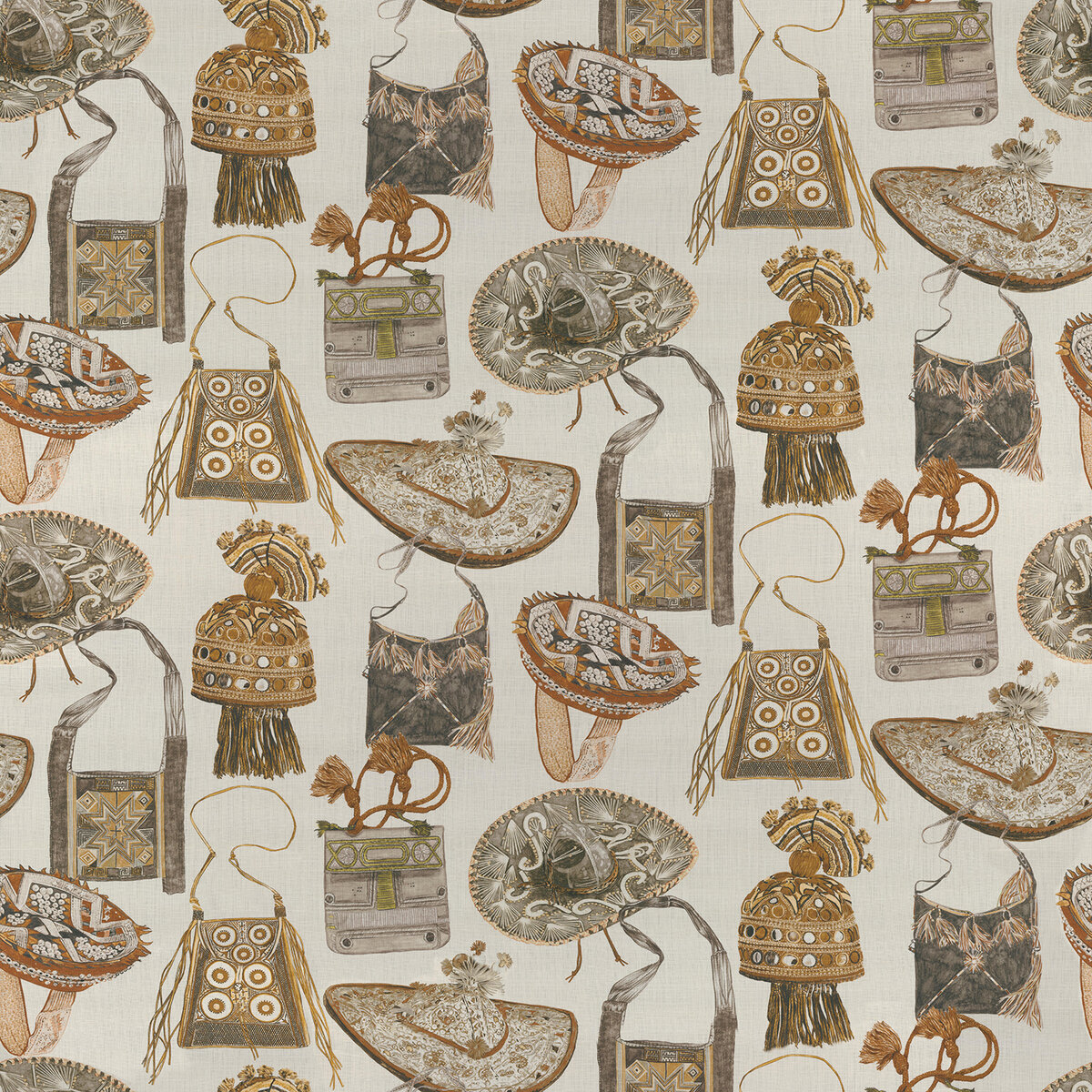 Kashan is an expression meaning ‘ancient cities’ reminiscent of exploration. Hats and bags are playfully arranged on the printed fabric as a homage to the craftsmanship of South America, Uzbekistan, India, and Vietnam.