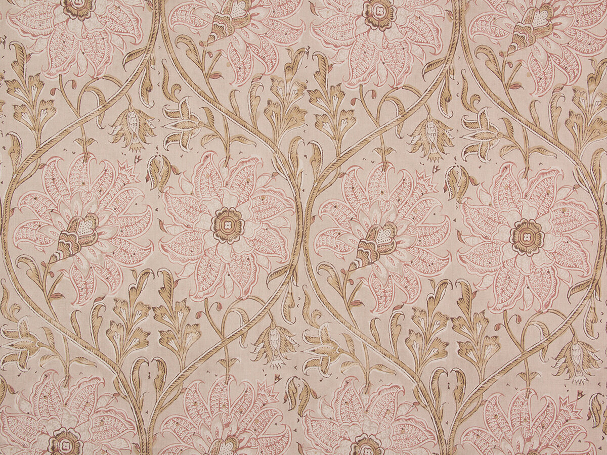 This exceptional border print floral Indienne is an exact recreation of a hand blocked Indian textile. Softly colored and printed on a rustic cotton/linen ground, Kingsley Indienne captures the essence of traditional Indian design.
