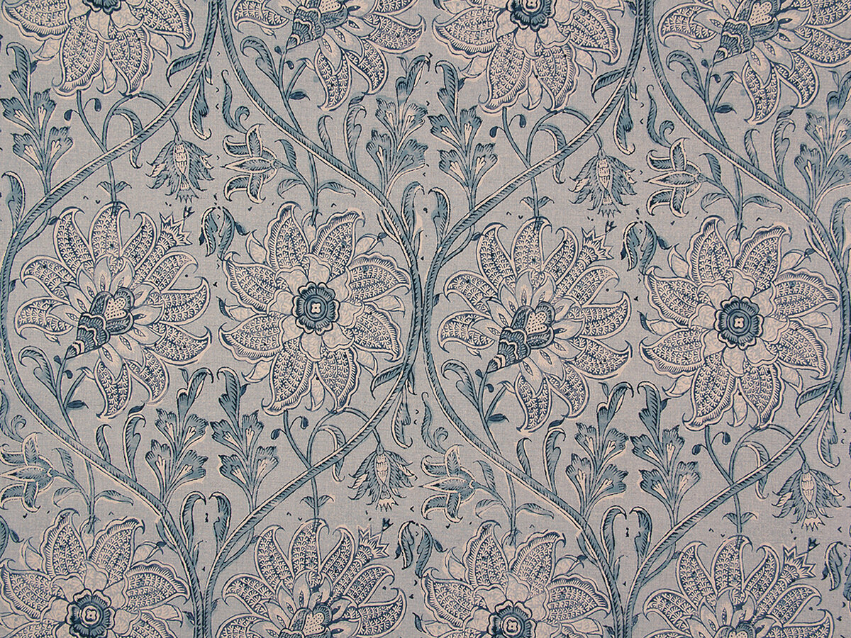 This exceptional border print floral Indienne is an exact recreation of a hand blocked Indian textile. Softly colored and printed on a rustic cotton/linen ground, Kingsley Indienne captures the essence of traditional Indian design.