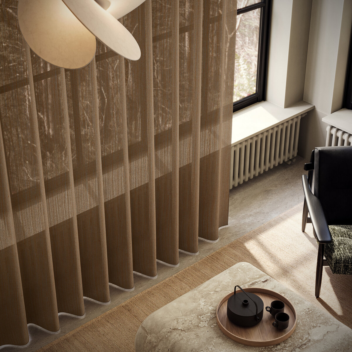 KITTY embodies lightness. Its open weave and vertical strié effect make it a flexible option for modern window styling. Whether as panel blinds, roller blinds, or room dividers – KITTY adds structure without heaviness.