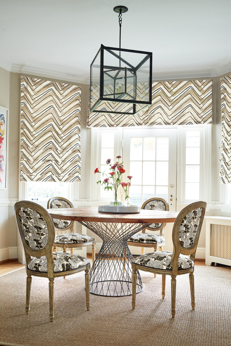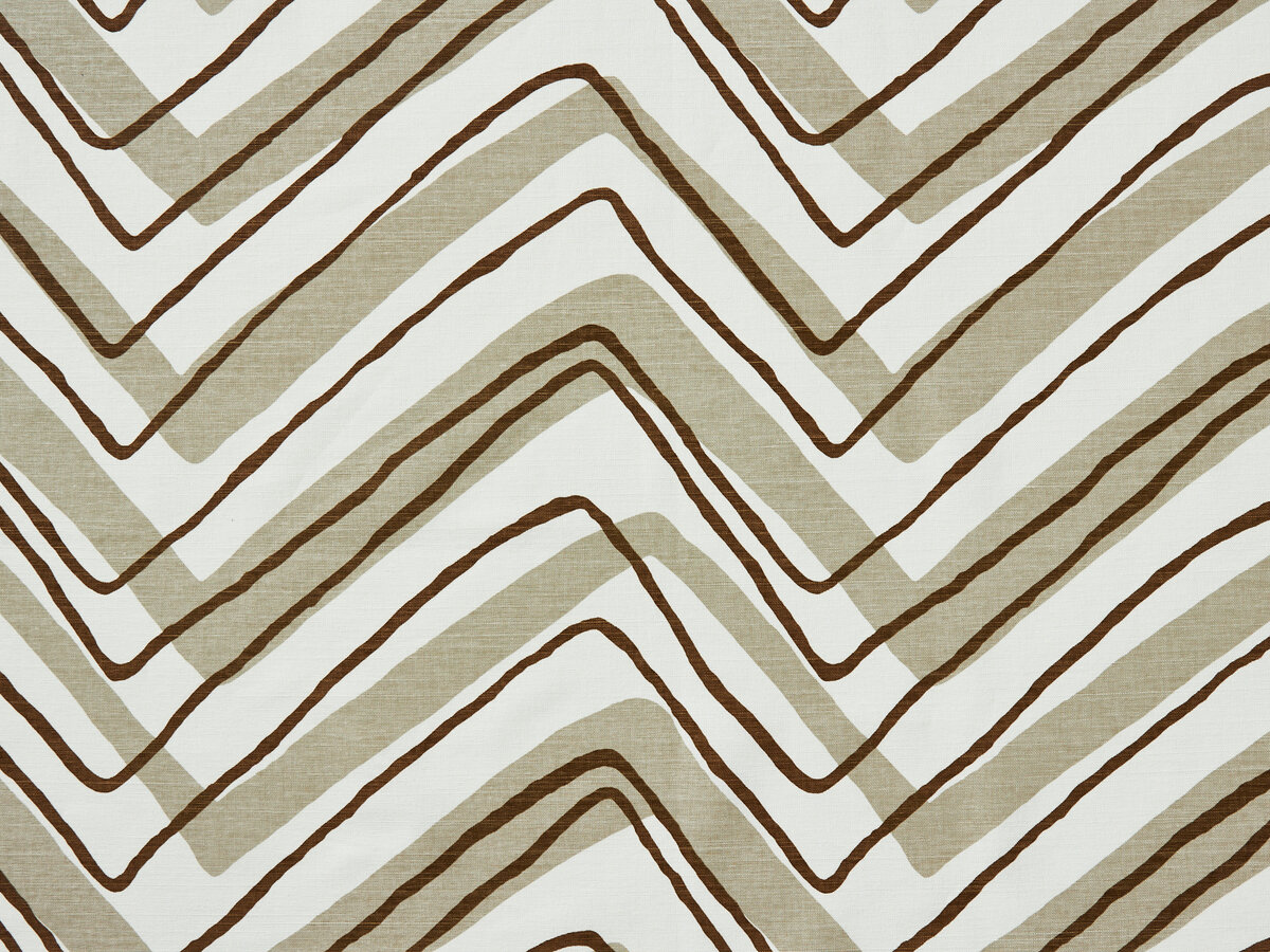 KUDU CHEVRON is another design resurrected from the Travers archive. This playful screen printed chevron dances across the fabric, like a herd of Kudu galloping through the woodland. Comprised of two colours, the thicker chevron line is printed first, with the thinner line placed directly on top. Printed on a blended cotton and linen cloth, the density of the pigment dye is very important for the design to be successful.