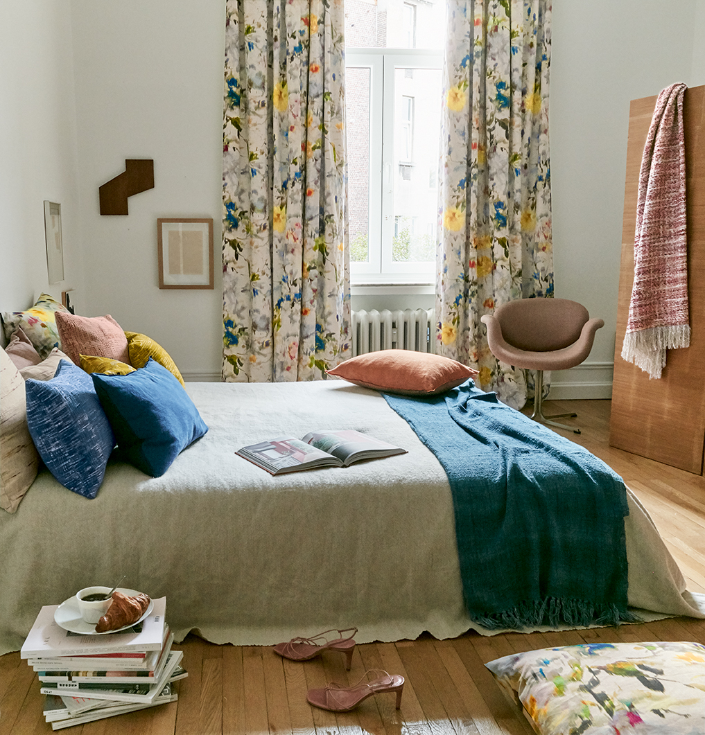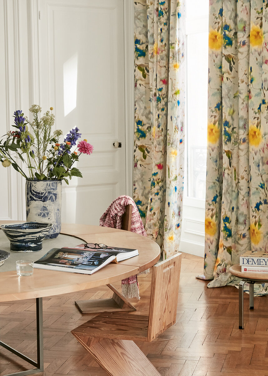 Somewhere between realism and decoration – LE BOUQUET attests to the new flowery harmonies of Etamine: modern and feminine. Although the design represents flowers, colour predominates and the petals mix for a look that is abstract, with modern charm. The design, digitally printed on linen, sets the colours free, and every nuance that makes it up testifies to the savoir-faire of Etamine. The colours of the buds are inspired by the flower market in Saint-Tropez and pay homage to the fauvist palette of Henri Matisse. The powder-white and mauve shades call to mind the freshness and memories of spring; the multicoloured and coral variations are saturated with the light and heat of summer. For the sake of elegance, we have chosen to print on a linen cultivated in the north of France where the climate is favourable, guaranteeing a fibre length of at least 80 cm. We have opted for an Airo finish, which gives the product a soft feel and a fabulous drape – just how we like our linen today.