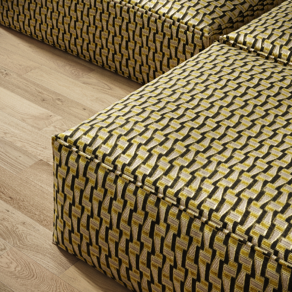 LETO Velvet’s geometric pattern combines relief structures, matte-shiny contrasts, and beguiling color mixes. The alternation between velvety velour and delicate epinglé contours creates a complex, rich all-over design with a pleasant surface effect.