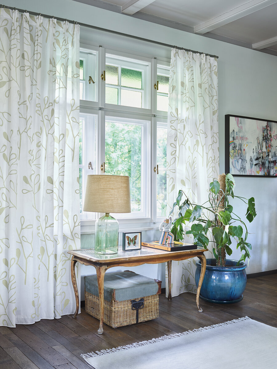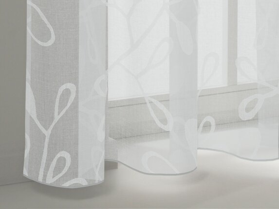 LILLIAN – a structured burn out par excellence. Its modern abstract leaf design is available in three subtle, natural colour schemes: wool white, green and taupe. The transparent, cottonlike base fabric underscores the natural radiance of this decorative inbetween.