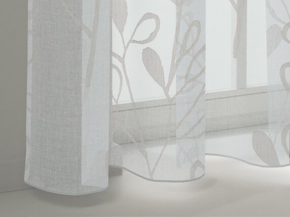 LILLIAN – a structured burn out par excellence. Its modern abstract leaf design is available in three subtle, natural colour schemes: wool white, green and taupe. The transparent, cottonlike base fabric underscores the natural radiance of this decorative inbetween.