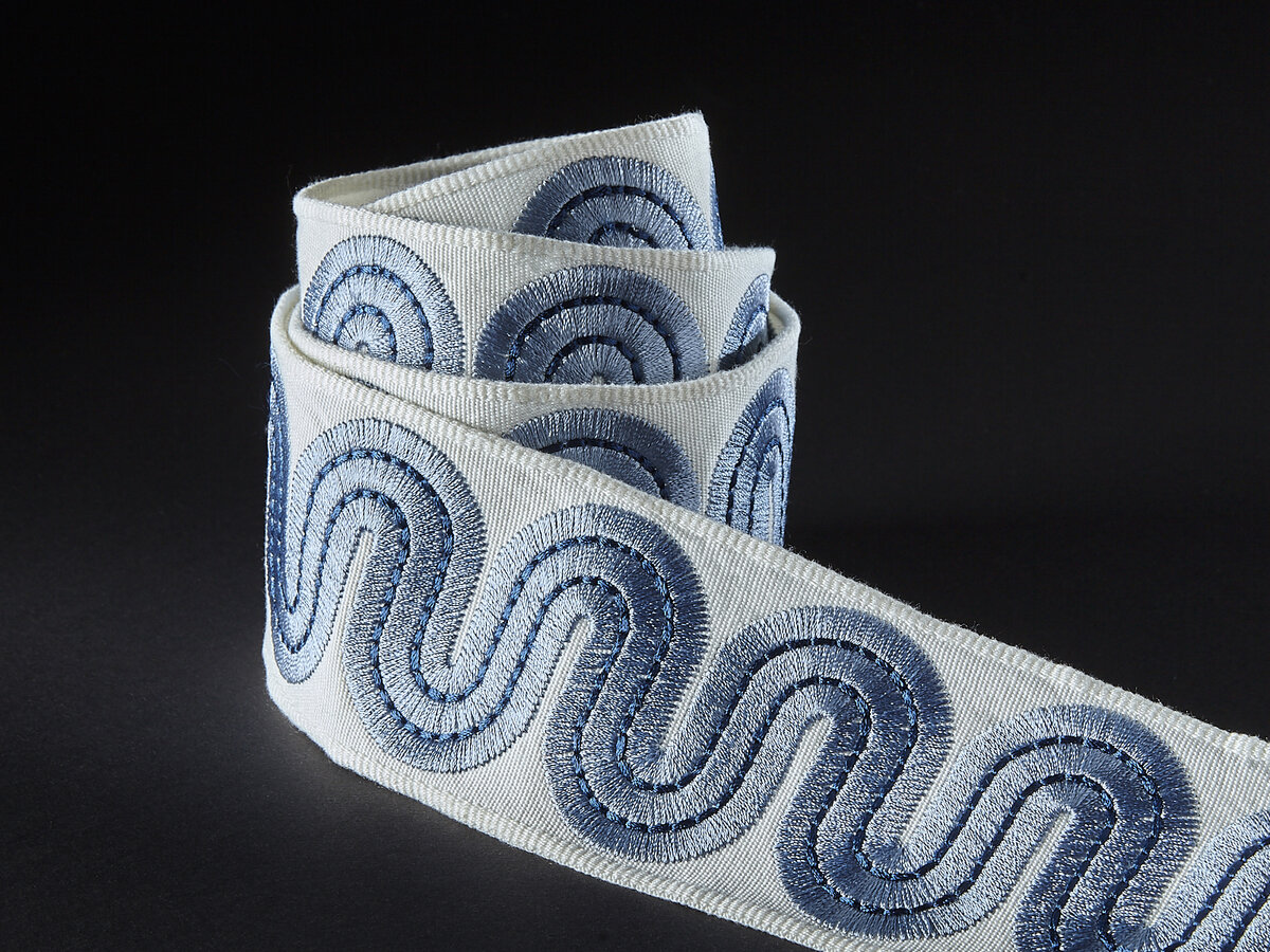 The graphic movement found in the deep wave of this tape was inspired by the iconic LOMBARD STREET in San Francisco. Embroidered on a woven tape custom made for this design, Lombard Street is a embroidery with two colours of viscose.